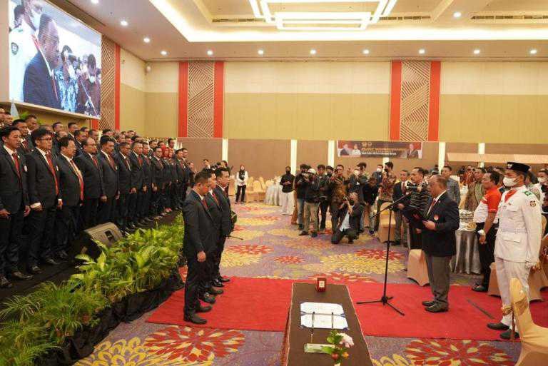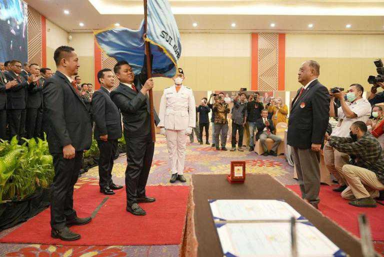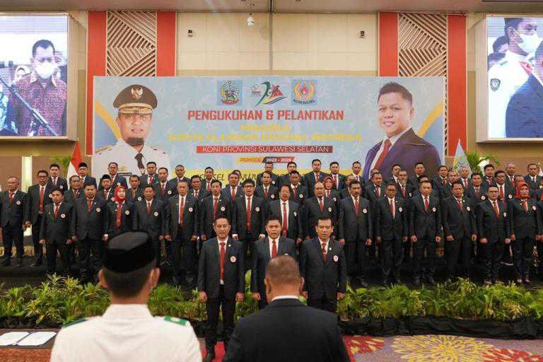 Gubernur Sulawesi Selatan, Andi Sudirman Sulaiman menghadiri pengukuhan dan pelantikan Pengurus Komite Olahraga Nasional Indonesia (KONI) Sulsel Periode 2022-2026 di Hotel Claro, 10 Agustus 2022.