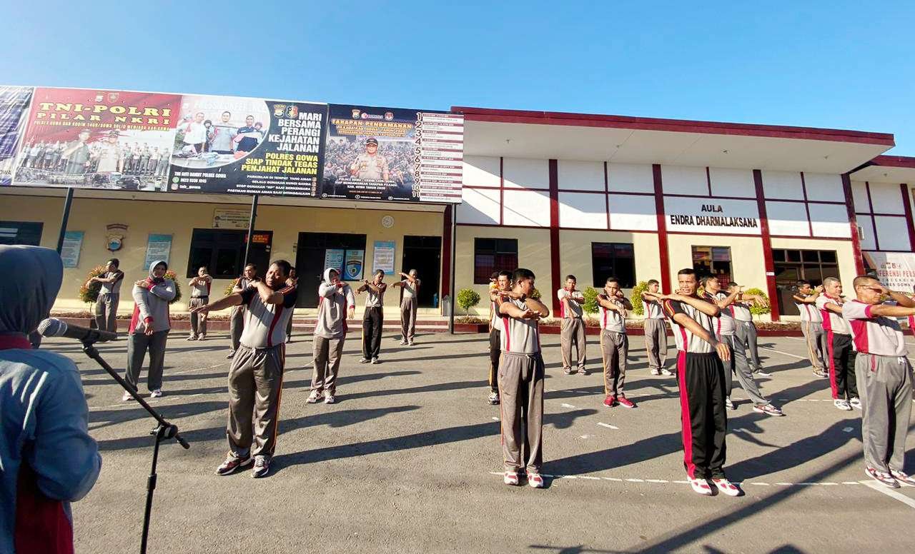 Dalam rangka mendukung pelaksanaan tugas personil agar tetap bugar dan prima, Polres Gowa kini membudayakan gerakan stretching/peregangan otot usai melaksanakan apel pagi.