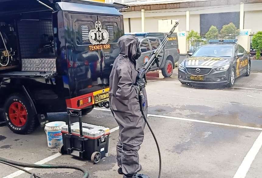 Tampak Tim Kimia Biologi Radioaktif Gegana Brimob Polda Sulsel yang secara khusus didatangkan dengan profesional menyiapkan semua peralatan dan bahan kimia guna dilakukan penyemprotan.