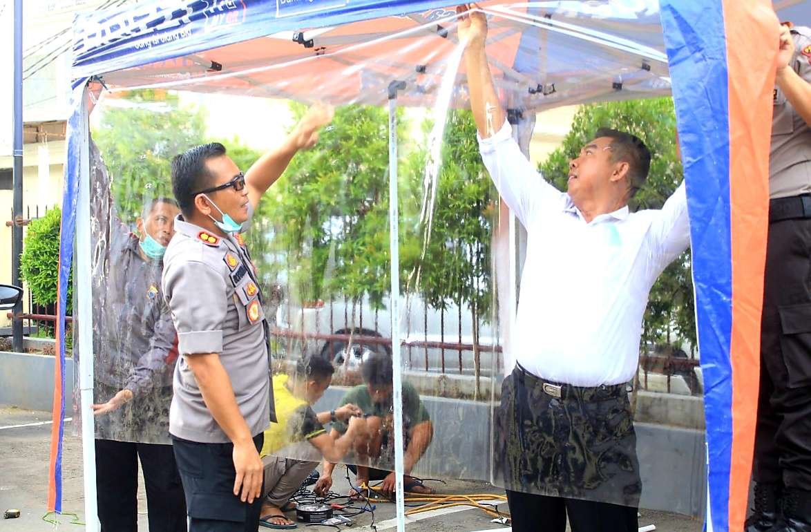 Pasca berdirinya bilik penyemprotan cairan disinfektan, Kapolres Gowa AKBP Boy Samola pada Senin (23/03/2029) sore pukul 17.30 Wita melakukan uji coba penggunaan sarana dan alat untuk mensterilkan virus Corona tersebut.
