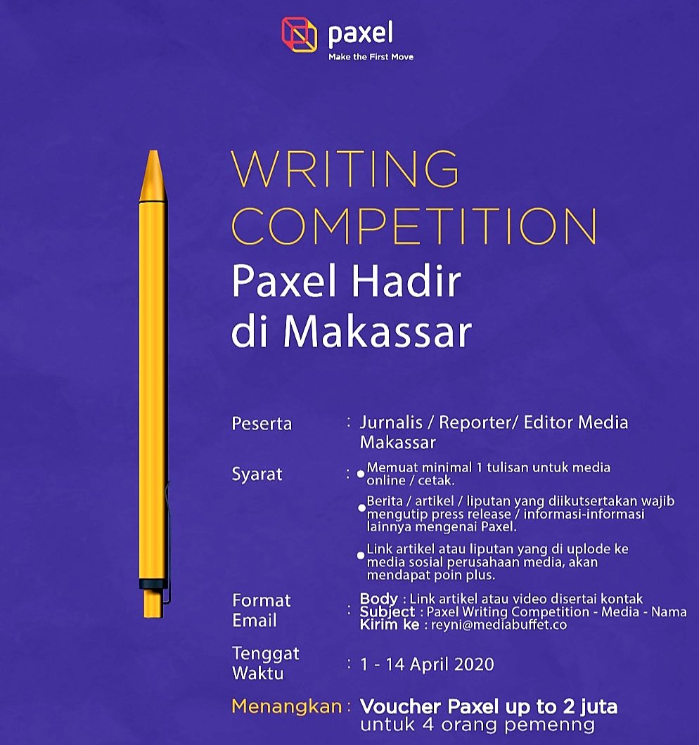 "Bersama dengan kabar gembira ini, kami juga ingin menginformasikan bahwa Paxel akan menggelar 'Paxel Media Writing Competition 2020' khusus untuk media Makassar yang diadakan tanggal 1-14 April 2020 dengan hadiah 'Voucher Paxel up to 2 juta' bagi empat orang pemenang," ungkap Runi.