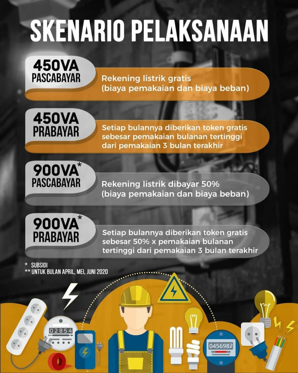 Kebijakan pemerintah tersebut membebaskan pembayaran listrik 24 juta pelanggan dengan daya 450 Volt Ampere (VA) dan memberikan diskon 50 persen bagi 7 Juta pelanggan dengan daya 900 VA bersubsidi. Keringanan biaya listrik ini akan berlaku selama tiga bulan yakni April, Mei, dan Juni 2020.