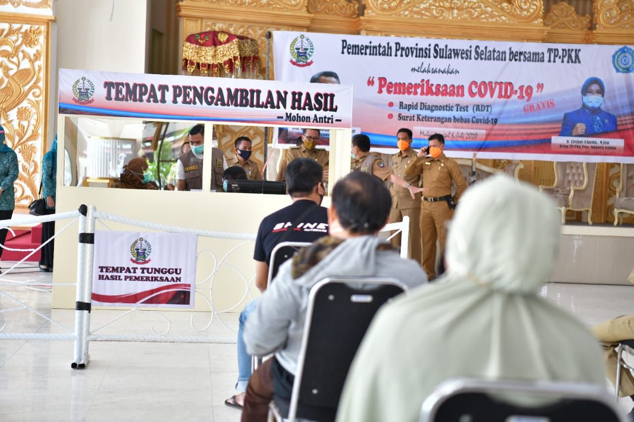 Gubernur Sulawesi Selatan (Sulsel), Prof HM Nurdin Abdullah, melakukan peninjauan ke lokasi rapid test gratis di Gedung PKK Provinsi Sulsel, di Jalan Masjid Raya Makassar, Senin (6/7/2020).