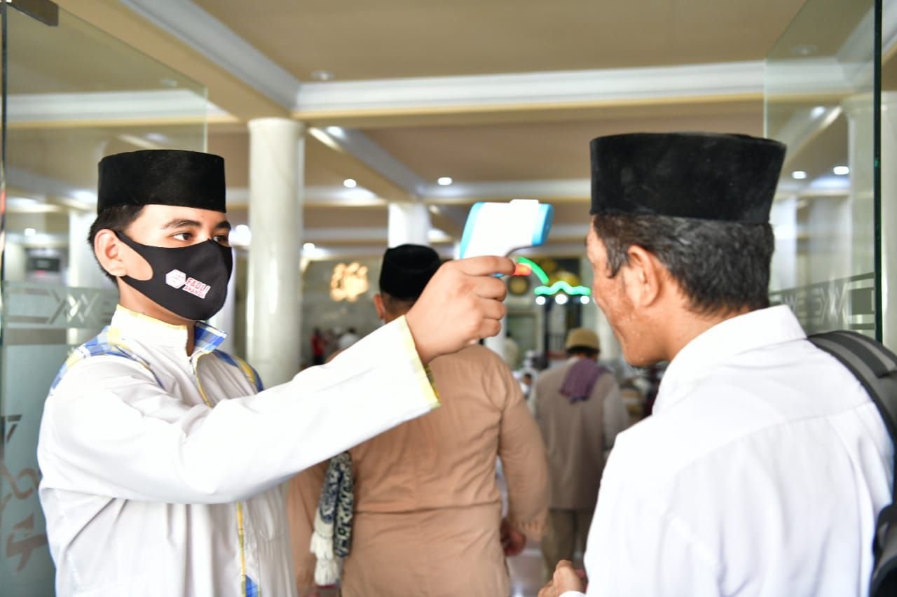Bersama Camat Ujung Tanah, Andi Unru, mensosialisasi protokol kesehatan kepada jamaah. Selain itu, Pemprov membagikan masker kepada jamaah yang tidak menggunakan masker. Jamaah yang masuk juga terlebih dulu dicek suhu tubuh.