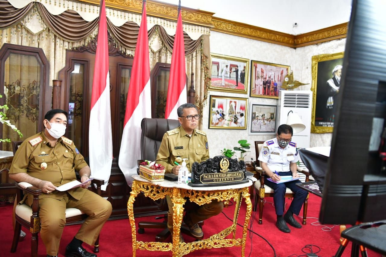 Gubernur Sulawesi Selatan (Sulsel), Prof HM Nurdin Abdullah, membahas progres pembangunan jalur Kareta Api (KA) Makassar - Parepare dengan Menteri Perhubungan (Menhub) RI, melalui Video Conference (Virtual), di Gubernuran, Selasa (21/7/2020).