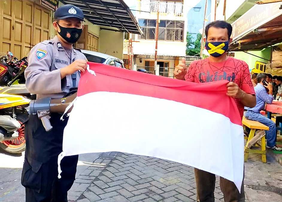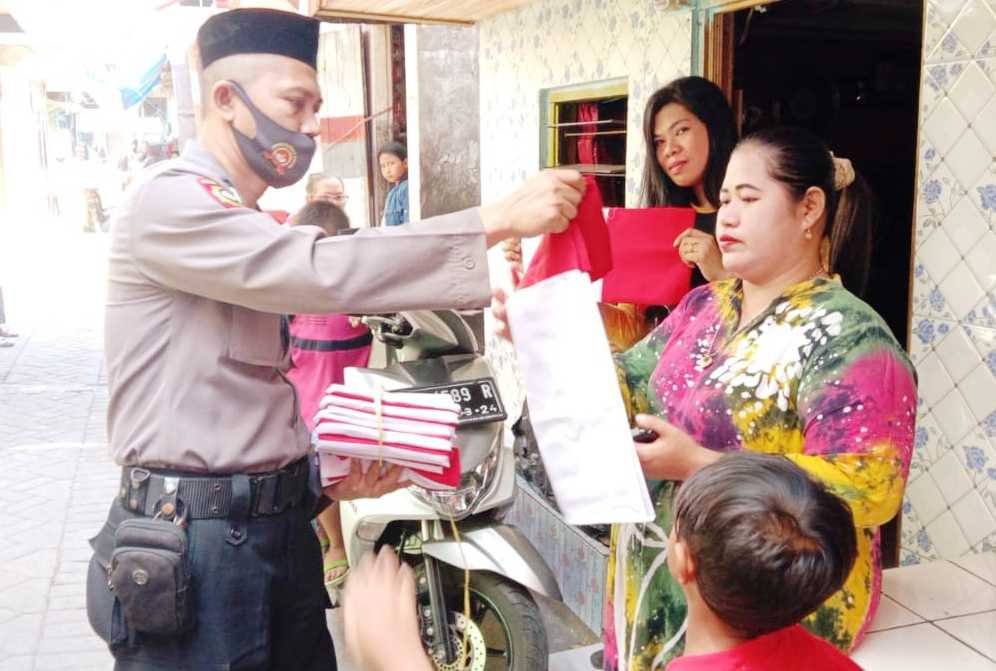 Satuan Binmas Polres Pelabuhan Makassar membagikan ratusan bendera merah putih kepada warga di dua kecamatan yakni Kecamatan Wajo dan Ujung Tanah dalam rangka menyemarakkan HUT ke-75 Kemerdekaan RI, Senin (17/08/2020).
