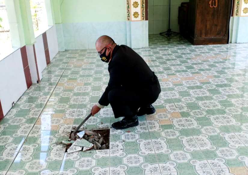 Dalam renovasi Mushallah ini, Kapolsek Bajeng Iptu Sunardi,SH, MH tanpa canggung melakukan pembongkaran pertama lantai bangunan yang sudah tidak layak, dan akan dilanjutkan dengan pemasangan keramik untuk lantai Mushallah yang baru.