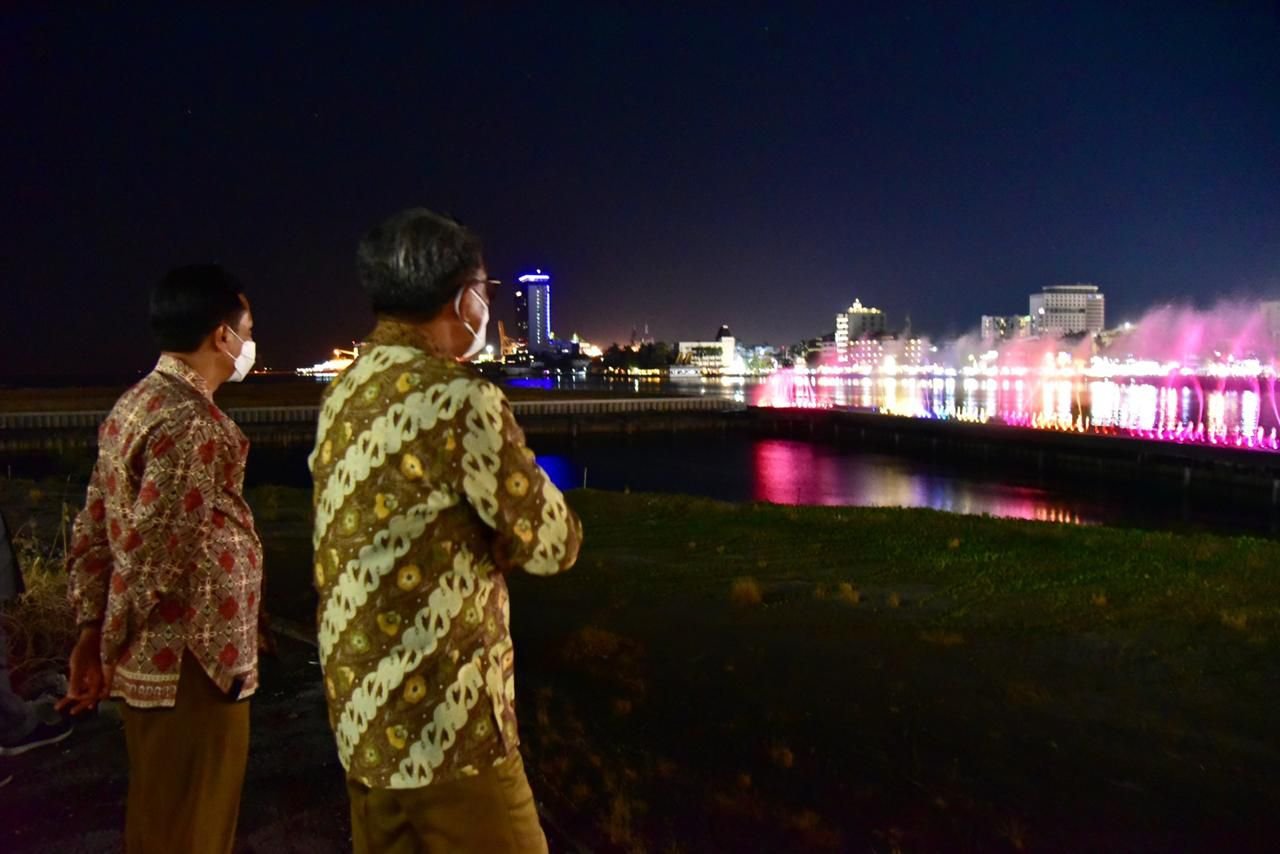 Sebelumnya, Nurdin Abdullah dan Rudy Djamaluddin meninjau lokasi tersebut pada Selasa (25/8/2020) malam. Air mancur dengan konsep penuh hiasan lampu yang diiringi irama lagu.