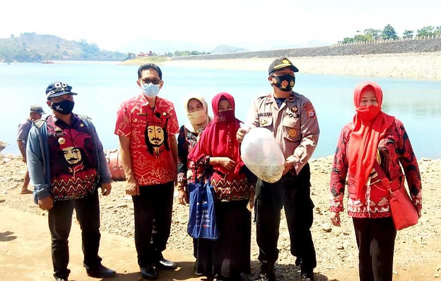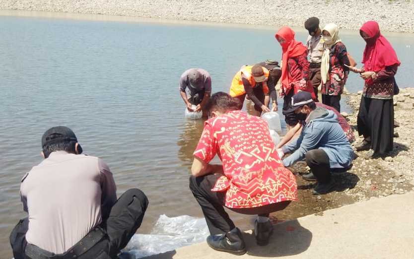 Mendukung ketahanan pangan nasional melalui sektor perikanan, Kapolsek Manuju Ipda Jamaluddin bersama Dinas Perikanan Kabupaten Gowa melepas 10.000 ribu bibit Ikan Nila di Bendunga Bili-Bili, Kamis (27/08/2020).