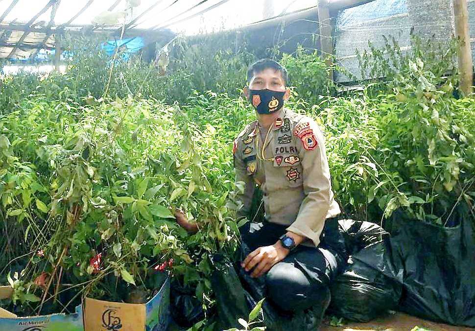 Kapolsek Tinggimoncong Polres Gowa Iptu Hasan Fadhlyh, SH menyiapkan bibit pohon untuk di tanam disepanjang jalan menuju puncak Gunung Bawakaraeng, Kamis (27/08/2020).