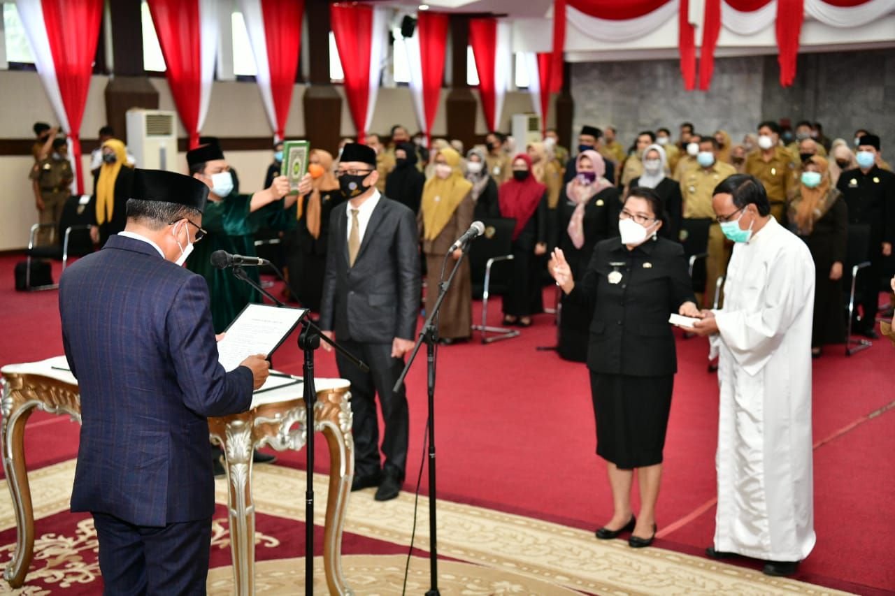 Gubernur Sulawesi Selatan (Sulsel), Prof HM Nurdin Abdullah, melantik dua pejabat Eselon II dan puluhan pejabat Eselon III dan IV, di Ruang Pola Kantor Gubernur Sulsel, Selasa (1/9/2020).
