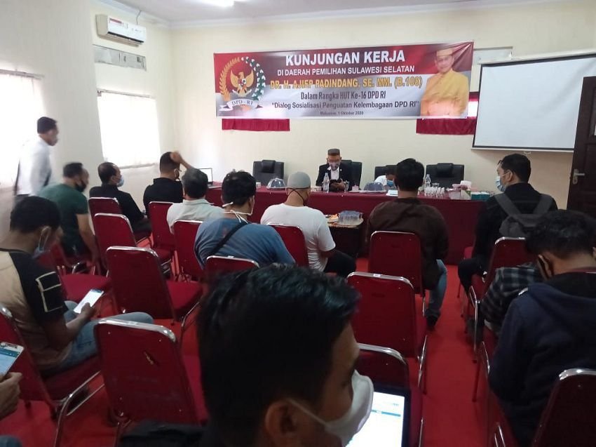 Dr. H. Ajiep Padindang, SE, MM, selaku anggota DPD RI, mengadakan diskusi lepas dalam kaitan memperingati ulang tahun DPD RI, di kantor perwakilan kesekjenan DPD RI Sulsel, Jl. Nuri, Makassar, Kamis (01/10/2020) siang tadi.