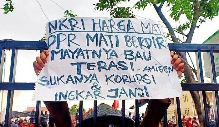 Sebelumnya posisi pengunjuk rasa di depan DPRD Sulsel ini terpecah-pecah seperti yang dilakukan dua hari sebelumnya. Mereka tidak menyatu satu sama lain, dibatasi dengan tali.