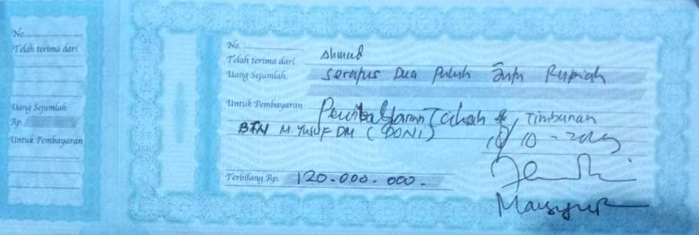 Kuitansi dan cek yang diserahkan Tawakkal, SH pengacara Ahmad, menjawab pertanyaan Hakim Ketua Ibrahim Palino tentang asal kuitansi dan cek itu, Ahmad kembali mengingatkan, bahwa kuitansi itu asli, diteken oleh Mansyur Lurah. Dan cek juga asli, kata Ahmad seraya menegaskan, asli dan kebenaran cek itu, bisa diketahui dari nomer dan nama Bank asal cek itu.