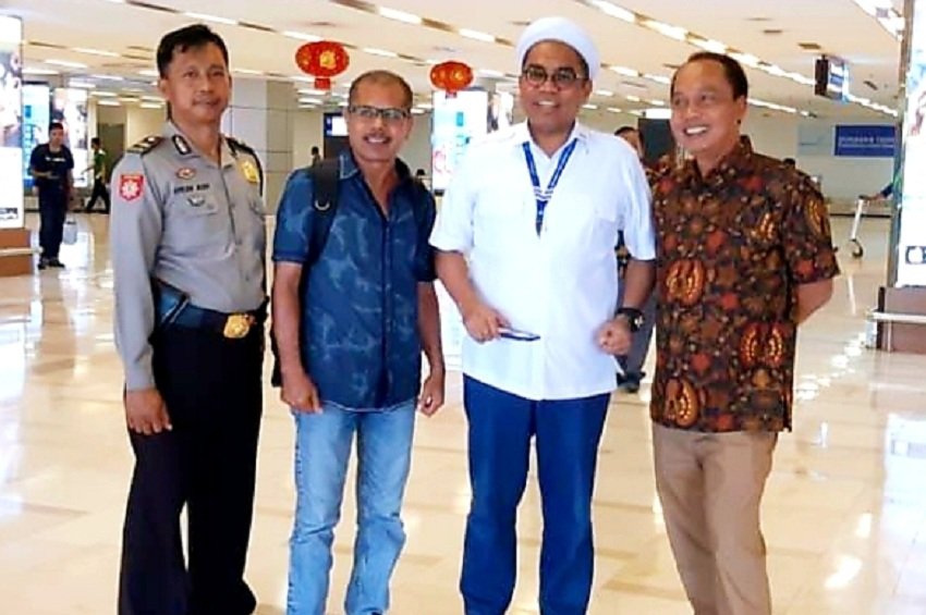 Kedatangan Ali Mochtar Ngabalin di Bandara Internasional Sultan Hasanuddin Makassar disambut oleh GM PT Angkasa Pura I, Wahyudi bersama Co GM PT Angkasa Pura I, Djon Herry dan Kasium Polsek Bandara, Ipda Amran Adam.