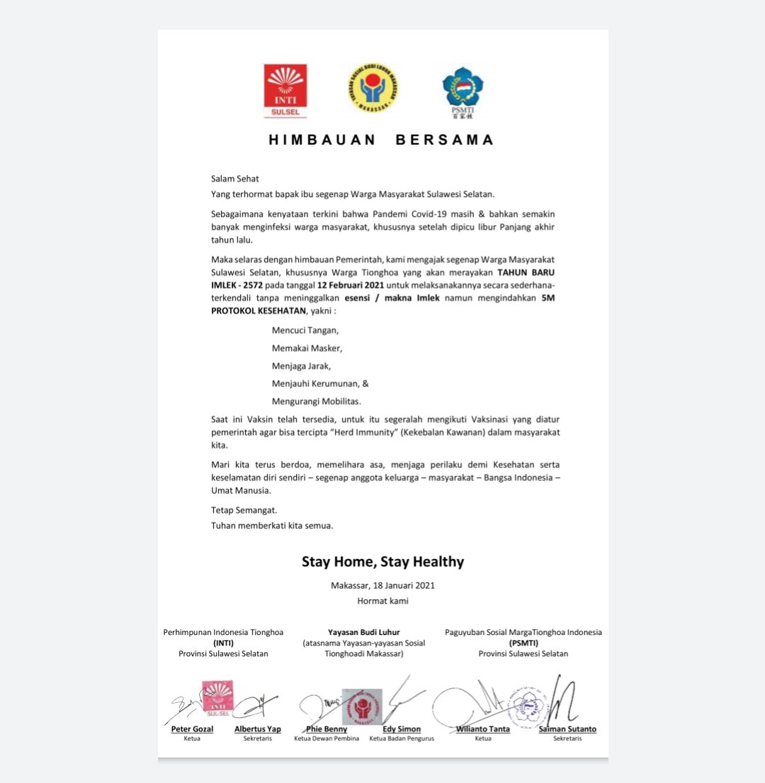 Surat Imbauan tertanggal 18 Januari 2021 ini ditandatangani pengurus Perhimpunan Indonesia Tionghoa (INTI) Provinsi Sulsel, Peter Gozal (Ketua) dan Albertus Yap (Sekretaris).