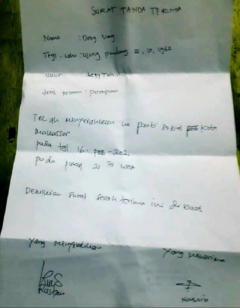 Ketika diinterogasi petugas hotel, wanita lansia yang status di KTPnya belum menikah, awalnya mengaku datang dari Surabaya. Tapi setelah berkali-kali ditanyakan dan didesak, ia lalu mengaku tinggal di Jln Veteran Selatan, Makassar.