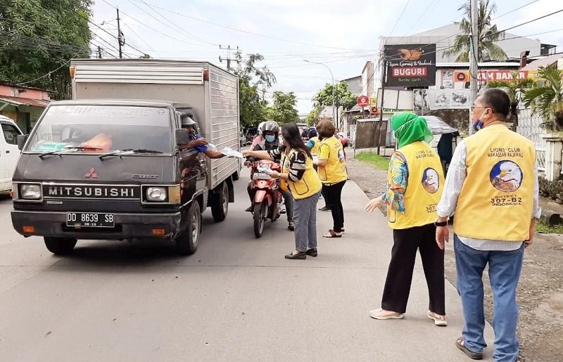 Lions Club Rajawali Makassar (LCMR) kembali menggelar kegiatan Regular Meeting dan juga aksi bakti sosial dengan turun ke jalan membagi-bagikan ratusan lembar masker medis kepada masyarakat pejalan kaki maupun pengendara motor dan mobil yang melintas di Jln Pelita Raya, Makassar, Jumat (05/03/2021) siang.