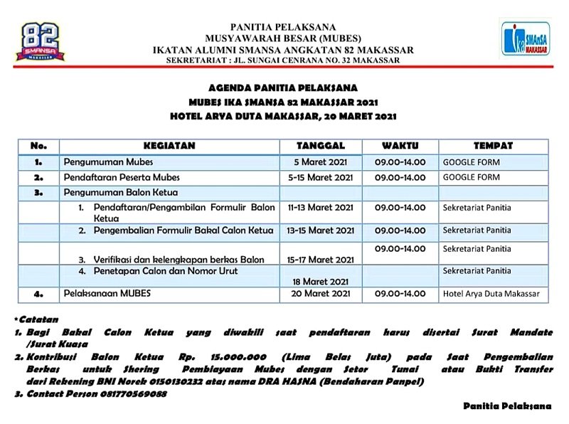 Penyelenggaraan Musyawarah Besar (Mubes) Ikatan Alumni (IKA) SMA Negeri 1 (SMANSA) Makassar Angkatan 82 yang direncanakan berlangsung Sabtu 20 Maret 2021 di Ballroom Alamanda, Hotel Aryaduta Makassar, terancam diwarnai kericuhan antar kelompok alumni.
