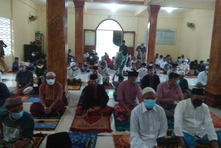 Masjid yang terletak di dalam kompleks SMAN 10 Tamangapa Makassar, menjelang matahari terbit, ummat Islam orang tua dan anak-anak dengan memakai semua masker dan jaga jarak mendatangi masjid yang dibangun dua lantai itu.