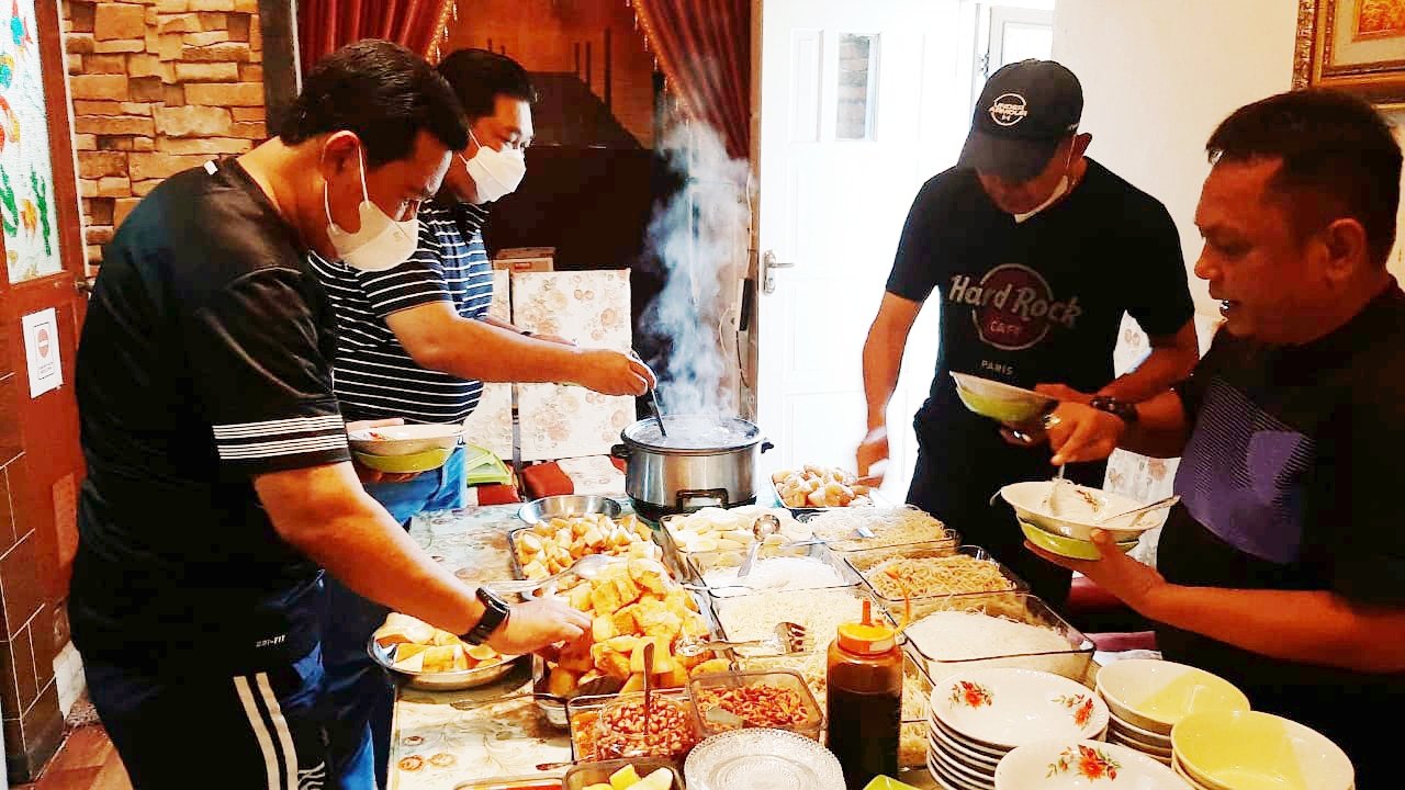 Usai bincang-bincang santai penuh suasana kekeluargaan, Wakapolda Sulsel dan isteri serta para alumni SMANSA SMART 82 dijamu makan siang bersama oleh pemilik rumah dengan menikmati sajian menu khas Kota Makassar yakni Sop Ubi.