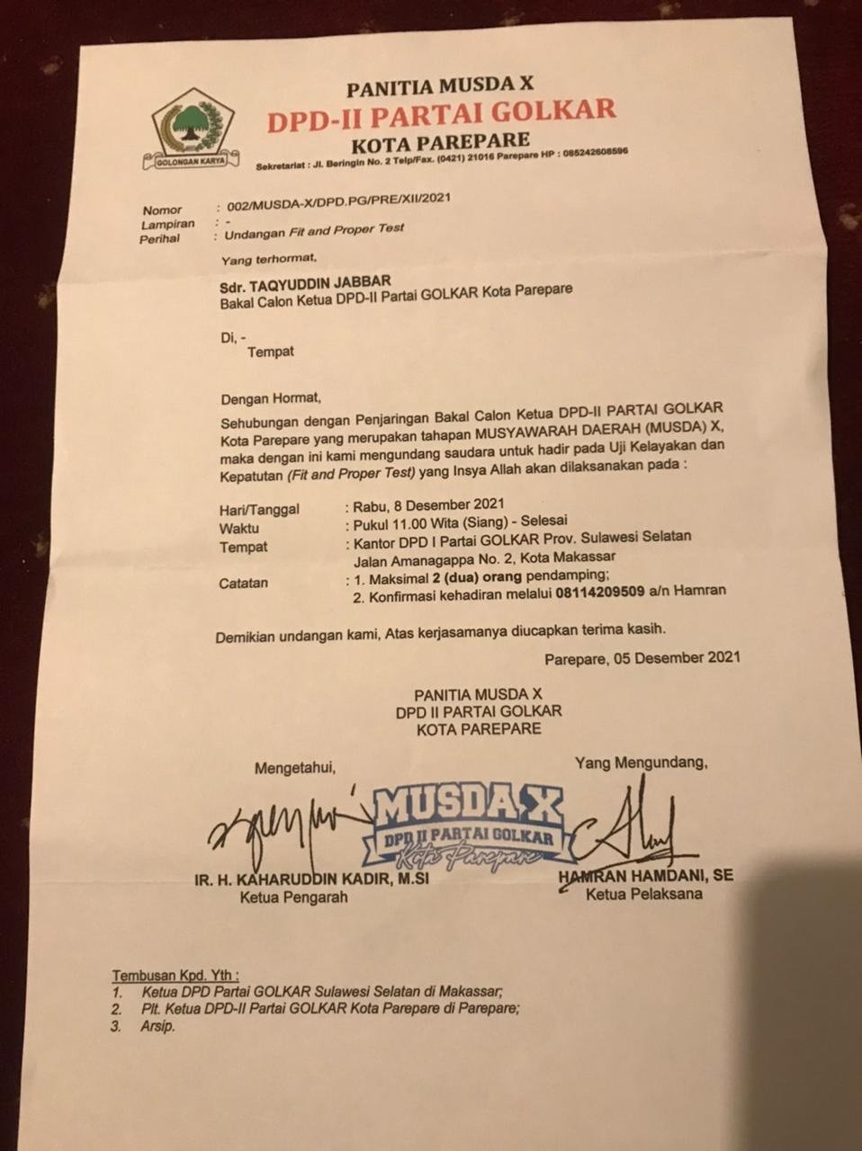 Ketua DPD Golkar Sulsel Taufan Pawe, Rabu (08/12/2021) siang langsung menguji calon Ketua DPD Golkar Parepare, Taqyuddin Jabbar, satu-satunya lawan Erna Rasyid -- isteri Taufan Pawe -- calon Ketua Golkar Parepare yang didukung oleh 7 organisasi sayap Golkar.
