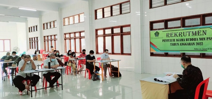Rekrutmen dalam bentuk tes tertulis dan wawancara calon Penyuluh Agama Buddha Non PNS Tahun 2022 ini dipimpin langsung Pembimas Buddha Sulsel, Pandhit Amanvijaya, S.Ag, MM, M.Pd.B yang berlangsung di Vihara Dharma Agung, Jl. Sungai Cerekang, Makassar, Jumat (24/12/2021).