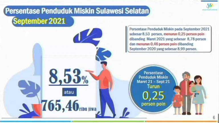 Sebagaimana paparan Kepala BPS Sulsel Suntono SE, M.Si dalam siaran persnya secara virtual, Senin, 17 Januari 2022, menyebutkan angka kemiskinan Sulsel per September 2021 sebesar 8,53 persen atau 765,46 jiwa.