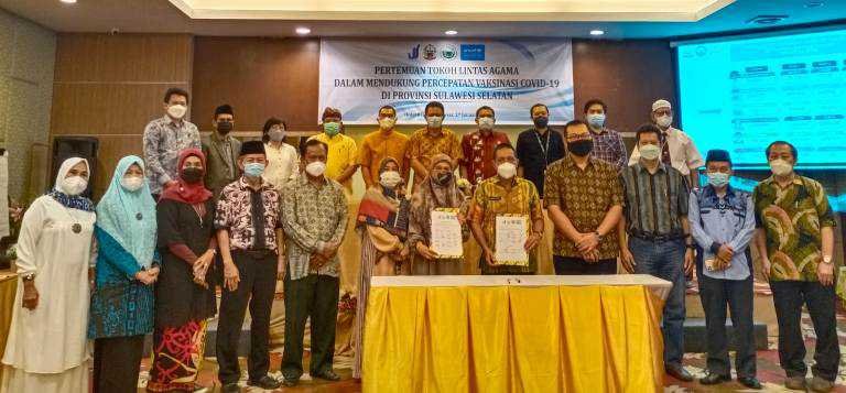 Sejumlah Tokoh Lintas Agama Sulawesi Selatan berdeklarasi untuk mendukung Penanganan Covid-19 dengan penerapan protokol kesehatan dan percepatan cakupan vaksinasi (kebut vaksinasi) di Sulawesi Selatan.