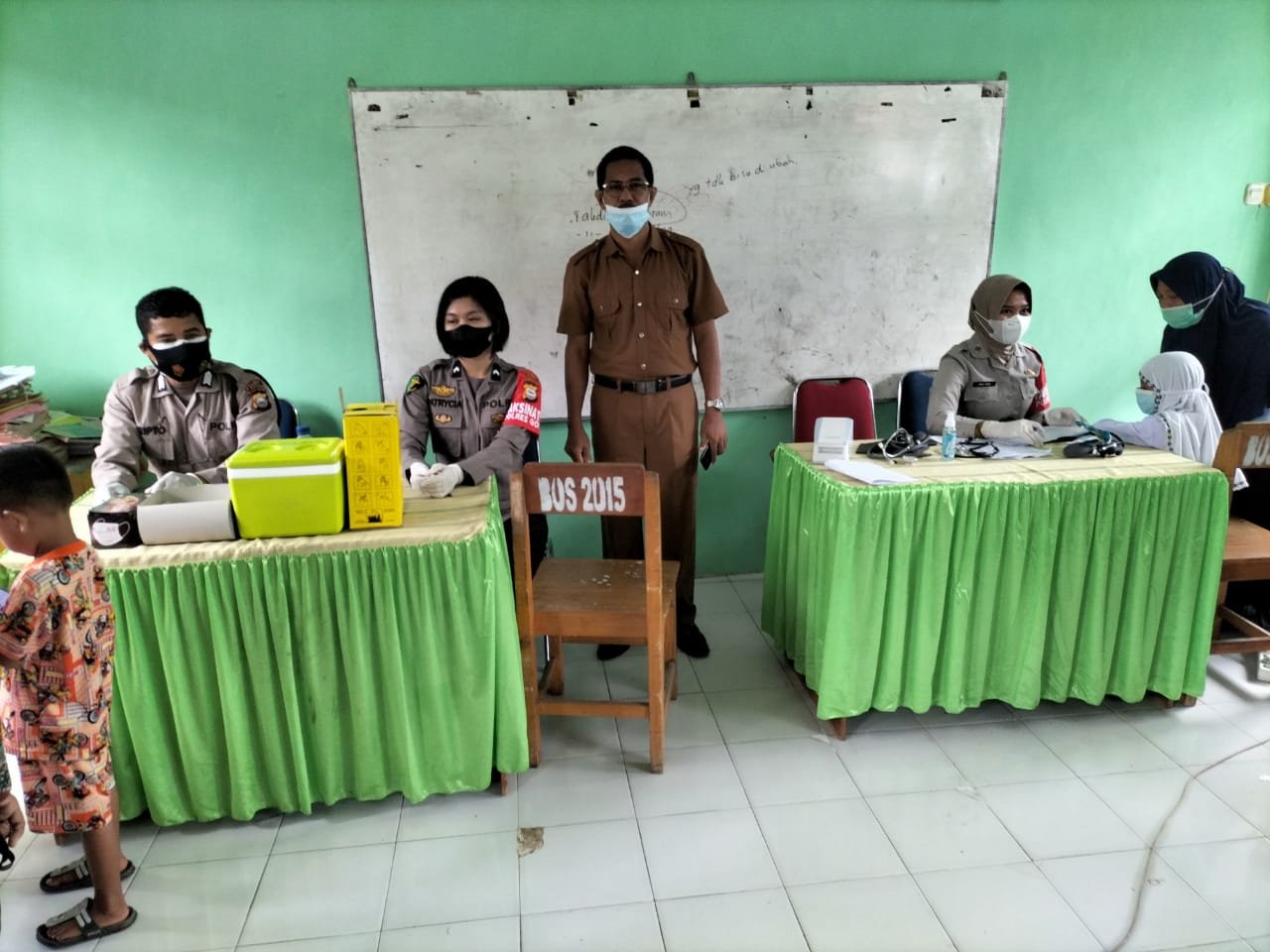 Berkaitan pelaksanaan Vaksinasi anak usia 6 -11 tahun, nampak personil Bhabinkamtibmas Aiptu Andi Krisbianto SH, melakukan pemantauan serta pendampingan bersama Panit Binmas dan orang tua siswa dalam pelaksanaan suntik vaksin guna memberikan semangat serta dukungan kepada pelajar tersebut agar tidak takut, karena vaksin tersebut aman dan halal.