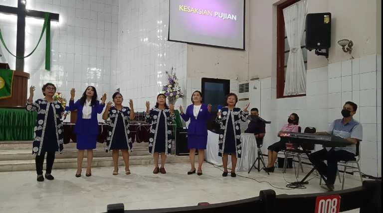 Paduan Suara Pelayanan Kategorial Perempuan (PKP) Sektor Pelayanan 6 GPIB Immanuel Makassar menyanyikan pujian pada hari ulang tahun PKP GPIB di Gereja GPIB Immanuel Makassar Jl. Balaikota Makassar, Jumat 11 Februari 2022.