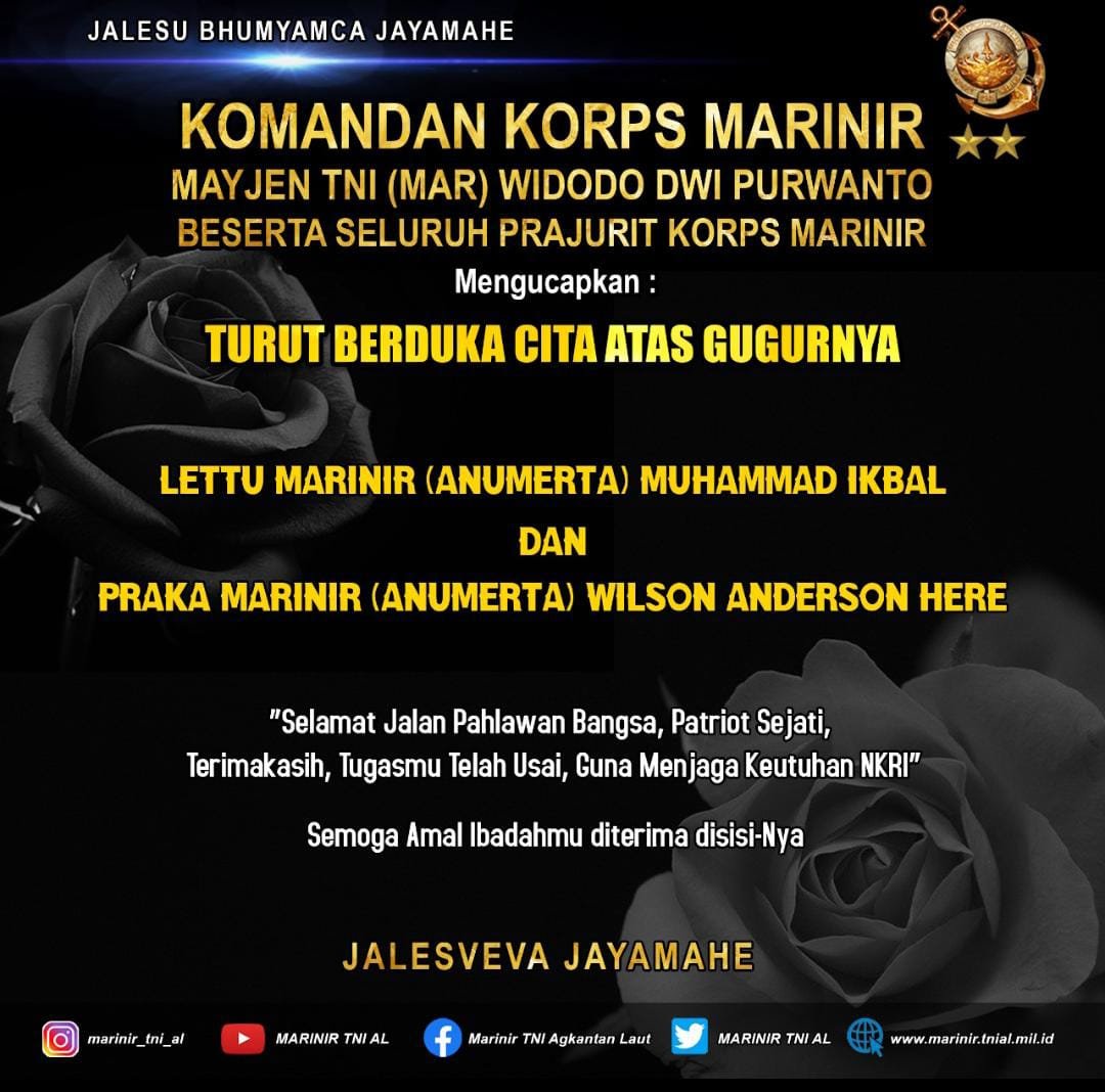 Keluarga besar TNI Angkatan Laut (AL) dan seluruh masyarakat Indonesia berduka akibat gangguan keamanan oleh Kelompok Separatis Teroris Papua (KSTP) Kodap III Ndugama yang melakukan serangan kepada Satuan Tugas (Satgas) Muara dan Pesisir (Mupe) Korps Marinir TNI AL di Pos Quary Bawah, Distrik Kenyam, Kabupaten Nduga, Papua, Sabtu (26/03/2022).