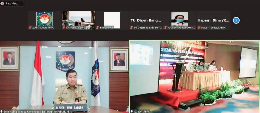 Pembukaan Pertemuan Pusat dan Daerah dilakukan oleh Dirjen Bina Bangda, Dr. Teguh Setyabudi yang menyampaikan pengarahan dan dihadiri langsung oleh Deputi Bidang Koordinasi Peningkatan Kualitas Anak, Perempuan, dan Pemuda Kementerian Koordinator PMK, Asisten Deputi Pemenuhan Hak, Perlindungan dan Pemberdayaan Perempuan, Kementerian Koordinator PMK, OPD yang menangani urusan Pemberdayaan Perempuan dan Perlindungan Anak Provinsi dan Bappeda Provinsi serta di hadiri secara online oleh Perwakilan Kementerian PPN/Bappenas, Perwakilan Kementerian Pemberdayaan Perempuan dan Perlindungan Anak.