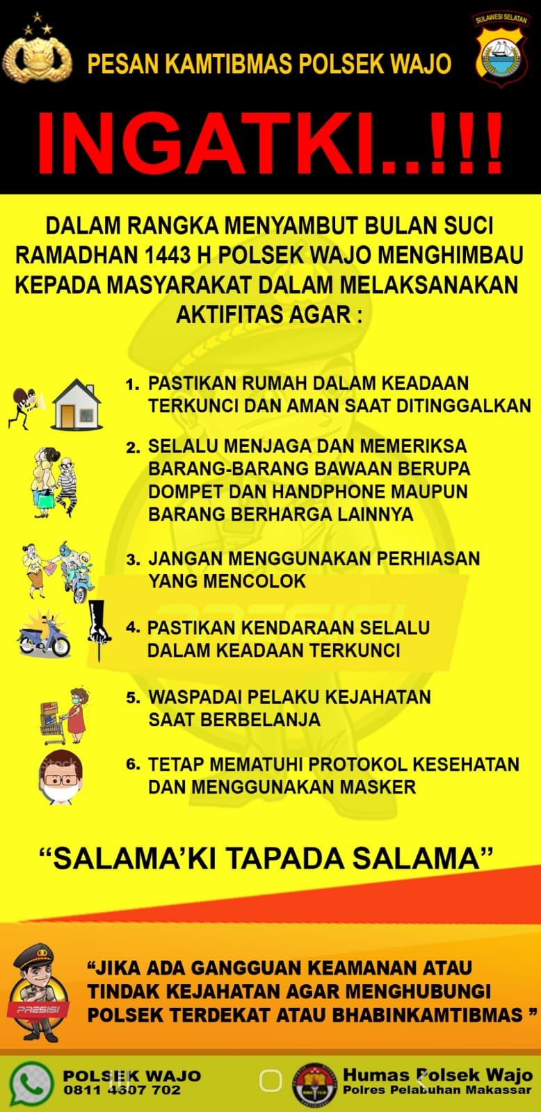 Terdapat beberapa poin imbauan kamtibmas yakni, (1) Pastikan rumah dalam keadaan terkunci dan aman saat di tinggalkan, (2) Selalu menjaga dan memeriksa barang-barang bawaan berupa dompet, handphone maupun barang berharga lainnya, (3) Jangan menggunakan perhiasan yang mencolok, (4) Pastikan kendaraan selalu dalam keadaan terkunci, (5) Waspadai pelaku kejahatan saat berbelanja, (6) Tetap mematuhi protokol kesehatan dan menggunakan masker.