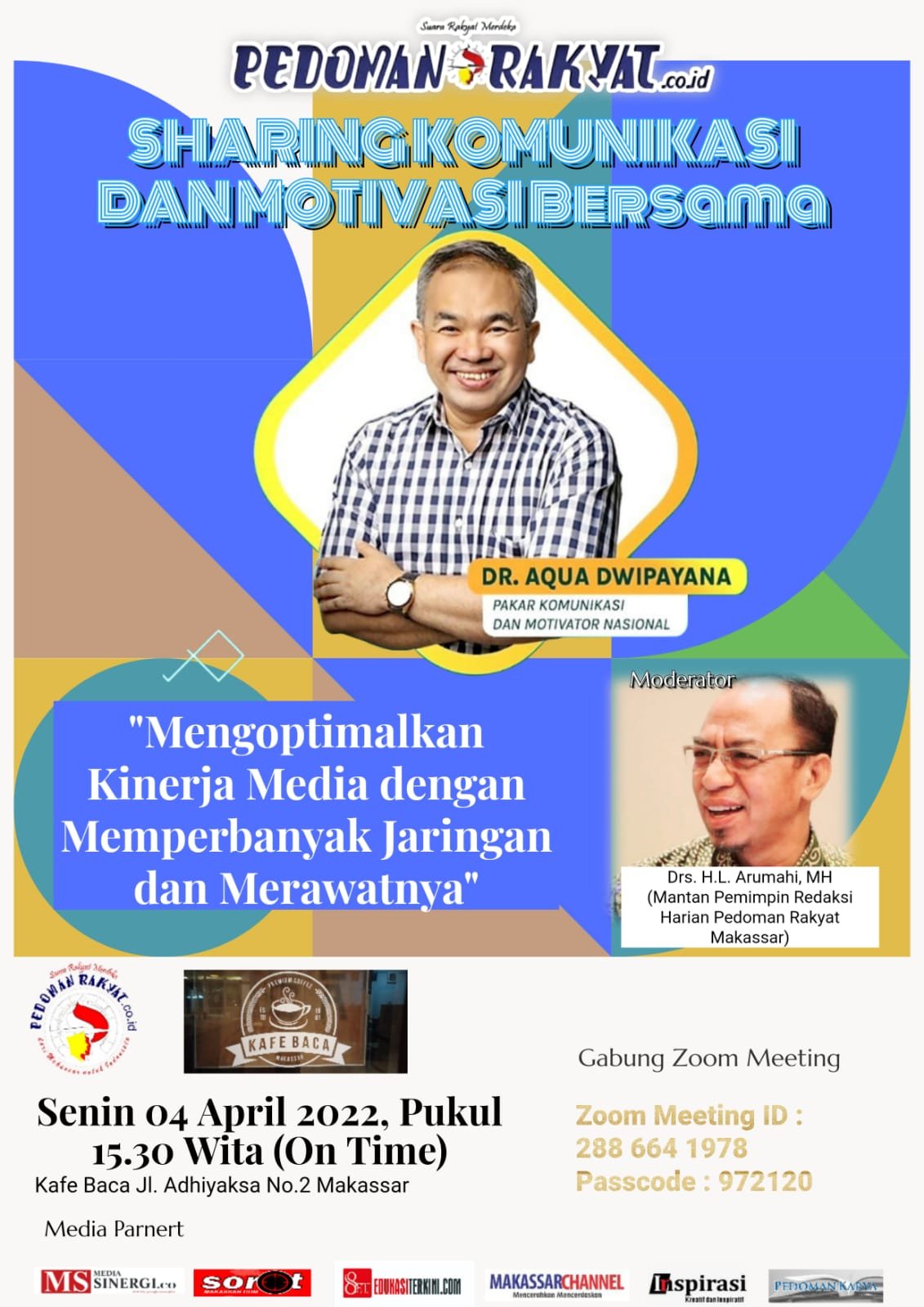 Mantan wartawan, konsultan komunikasi dan motivator Dr.Aqua Dwipayana, akan “sharing” (berbagi) dengan kru Pedoman Rakyat.co.id di Kafebaca Jl. Adyaksa Makassar, Senin (4/4/2022).
