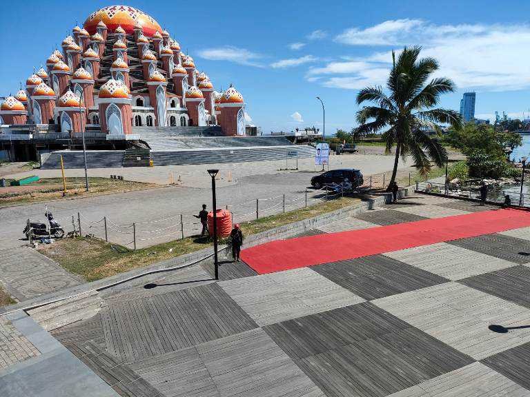Berdasarkan pantauan wartawan, Minggu (1/5/2022) pihak panitia Salat Ied di Pelataran Lego-Lego CPI sudah melakukan berbagai persiapan, termasuk memasang mimbar, level, backdrop, garis shaf, dan lain sebagainya.