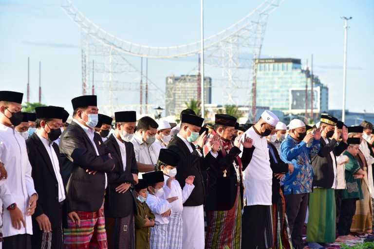 “Alhamdulillah, tahun ini dapat bersama masyarakat melaksanakan salat Idul Fitri 1443 H. Kami sendiri bersama keluarga di pelataran Masjid Kubah 99 Asmaul Husna,” ujar Andi Sudirman.
