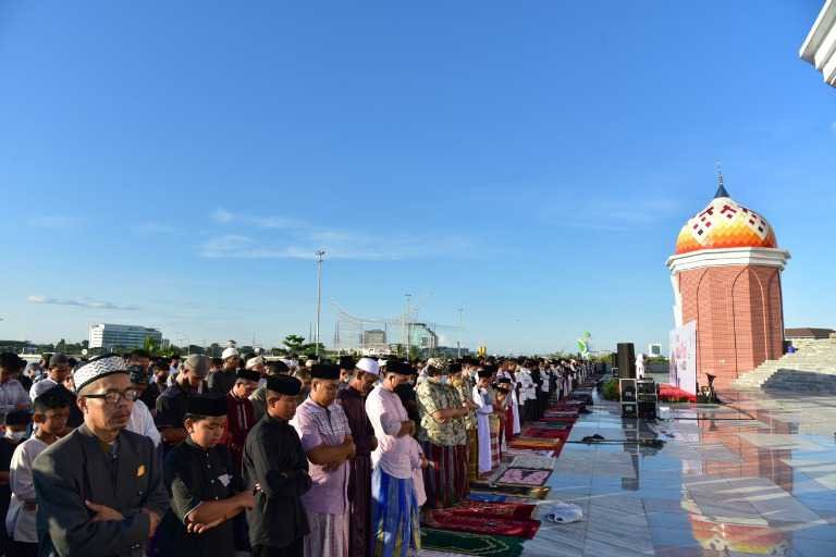 Sejumlah masyarakat memadati pelataran Masjid Kubah 99 Asmaul Husna dan pelataran Lego Lego di Center Point of Indonesia (CPI) Makassar untuk melaksanakan salat Idul Fitri 1443 H, Senin (2/5/2022).