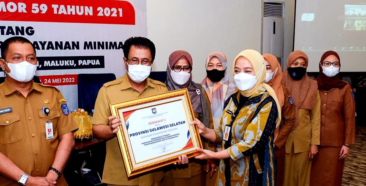 Penghargaan diberikan kepada daerah berkinerja terbaik penerapan SPM Tahun 2021 di regional II kepada Provinsi Sulawesi Selatan sebagai peringkat 2 Nasional dan Peringkat 1 untuk wilayah Kalimantan, Sulawesi, Maluku dan Papua. (*)