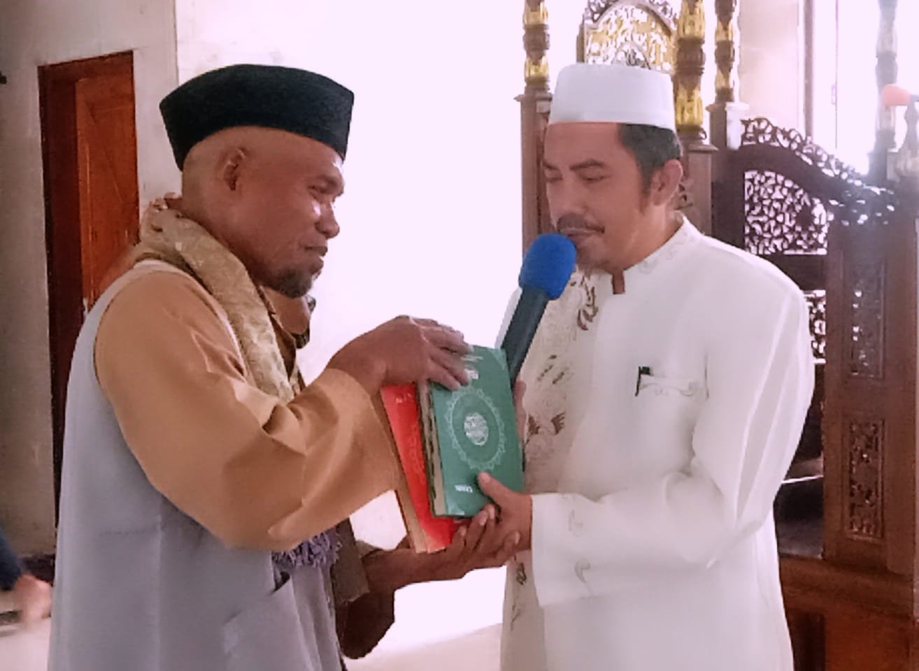Penyerahan secara simbolis Kitab Suci Al-Qur'an dari Udstaz Arifuddin Anwar, SE kepada Asisten II Setda Kepulauan Selayar, Ir H Arfang Arif disaksikan ratusan jamaah dan warga Kota Benteng usai melaksanakan Shalat Dhuhur secara berjamaah siang tadi. (mdsn)