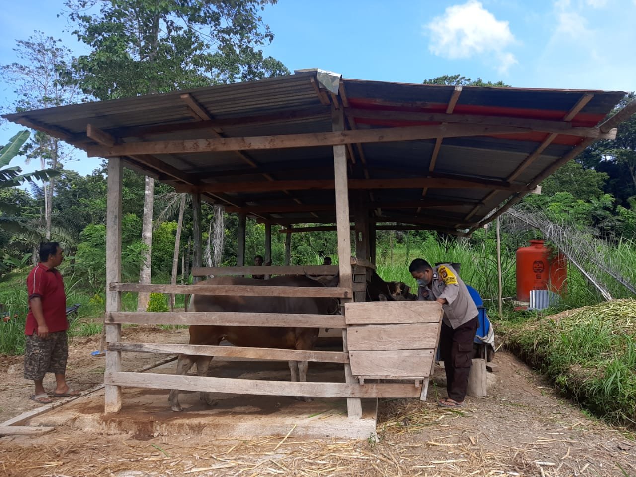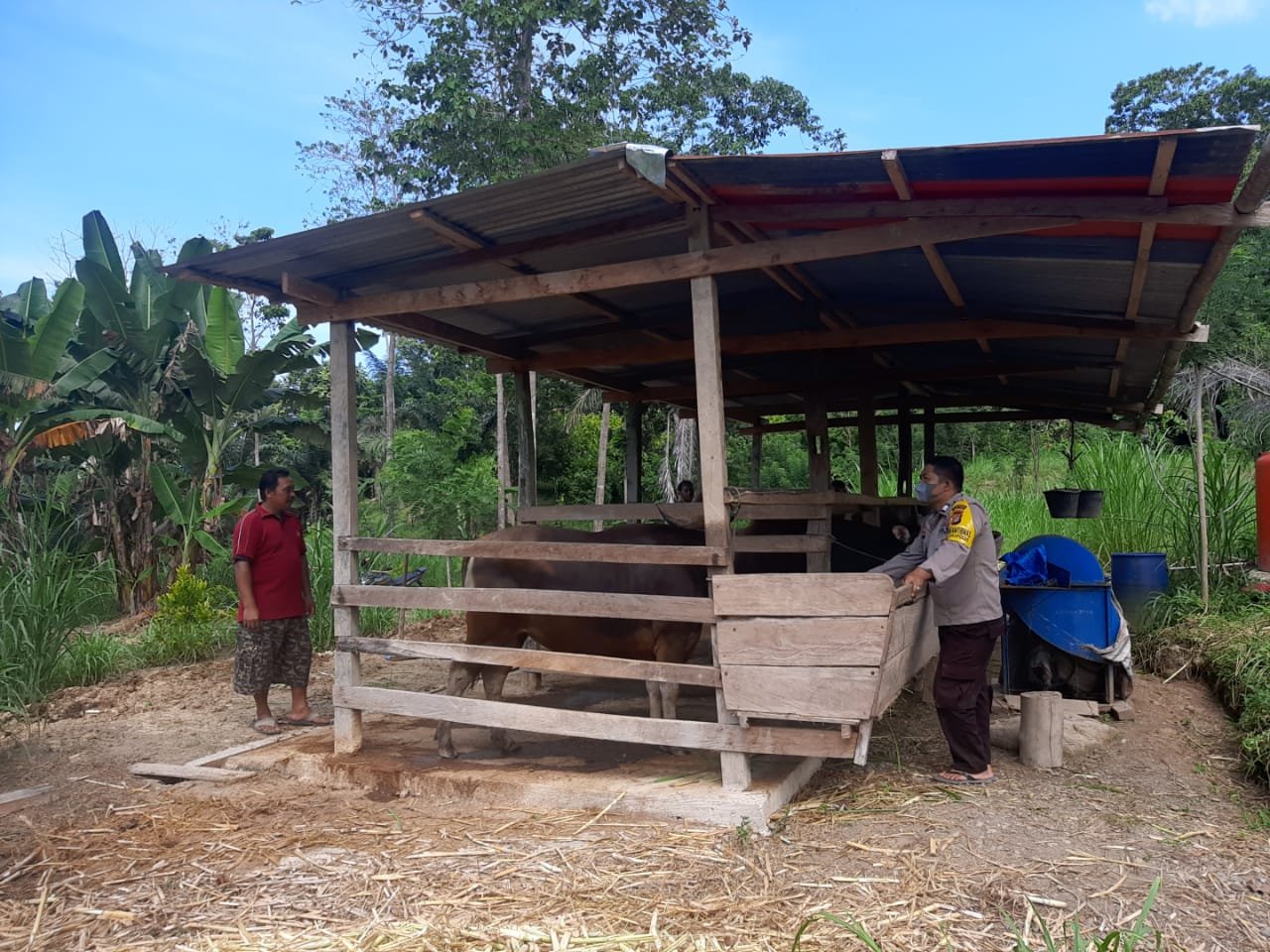 Selain melakukan pengecekan terhadap hewan ternak milik warga, Bhabinkamtibmas juga memberikan edukasi dan sosialisasi terkait PMK (Penyakit Mulut dan Kuku) kepada pemilik ternak.