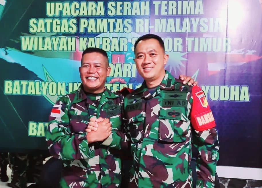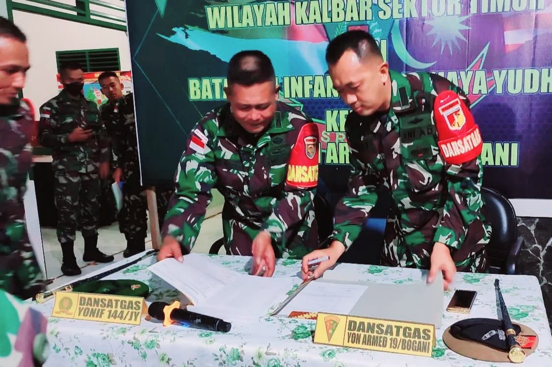 Serah terima alih Kodal Satgas Operasi Pamtas RI-Malaysia dari Yonif 144/Jaya Yudha (JY) kepada batalyon pengganti Yonarmed 19/105 Trk Bogani yang bertempat di seluruh jajaran Pos Pamtas RI-Malaysia, Sabtu (04/06/2022).