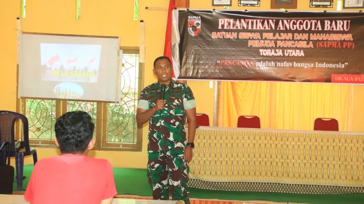Dandim 1414 Tana Toraja memberikan materi bela negara dan dasar kepemimpinan kepada siswa, mahasiswa baru dan ormas Pemuda Pancasila. Kegiatan itu berlangsung di Aula Kantor Kecamatan Tikala, Kabupaten Toraja Utara, Minggu (12/06/2022).