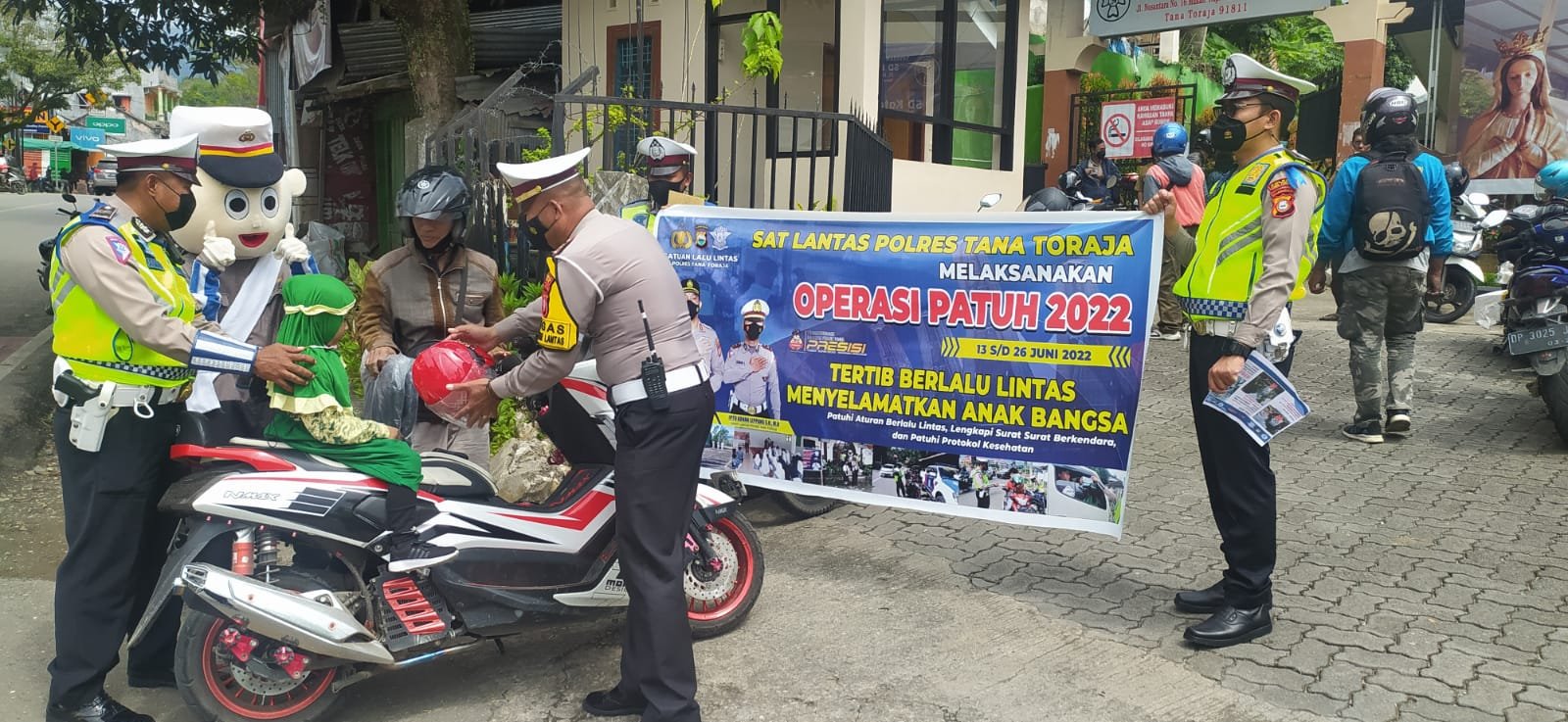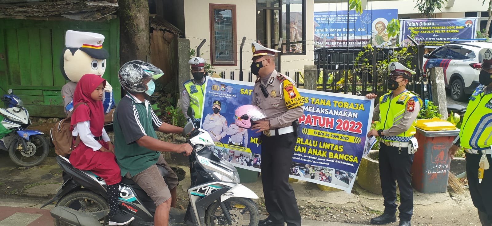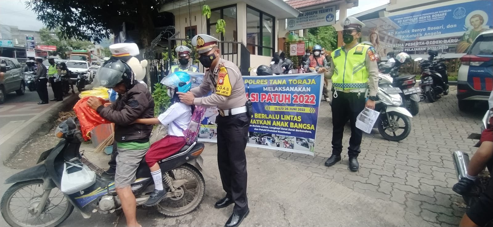 Pasca apel gelar pasukan Operasi Patuh 2022 Polres Tana Toraja, Senin (13/06/2022), personel Satuan Lalulintas (Satlantas) bersama tim operasi lainnya langsung turun lapangan. Salah satu kegiatannya mengedukasi anak Sekolah Dasar (SD) Rosario, Paku, Makale, sekitar pukul 10.50 Wita saat murid pulang sekolah dibonceng orang tuanya tidak gunakan helm.