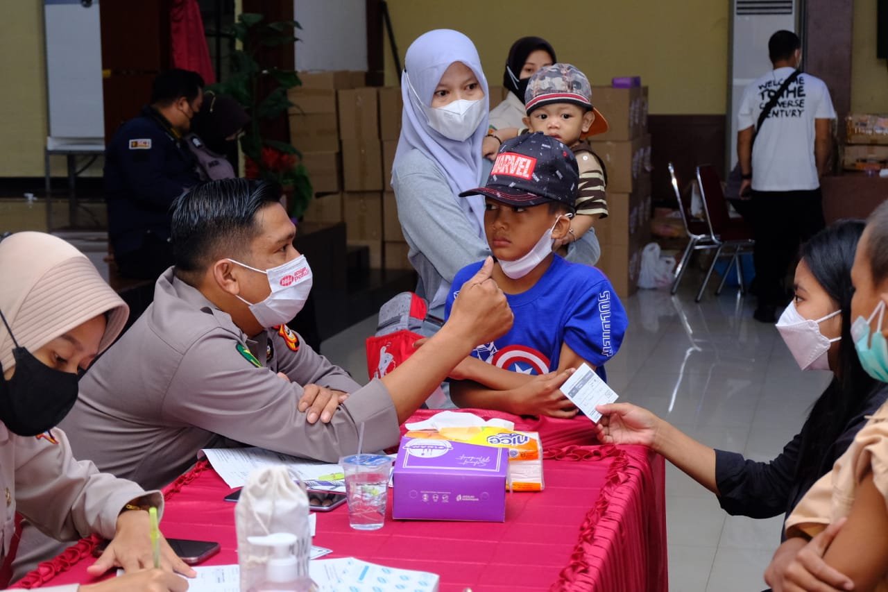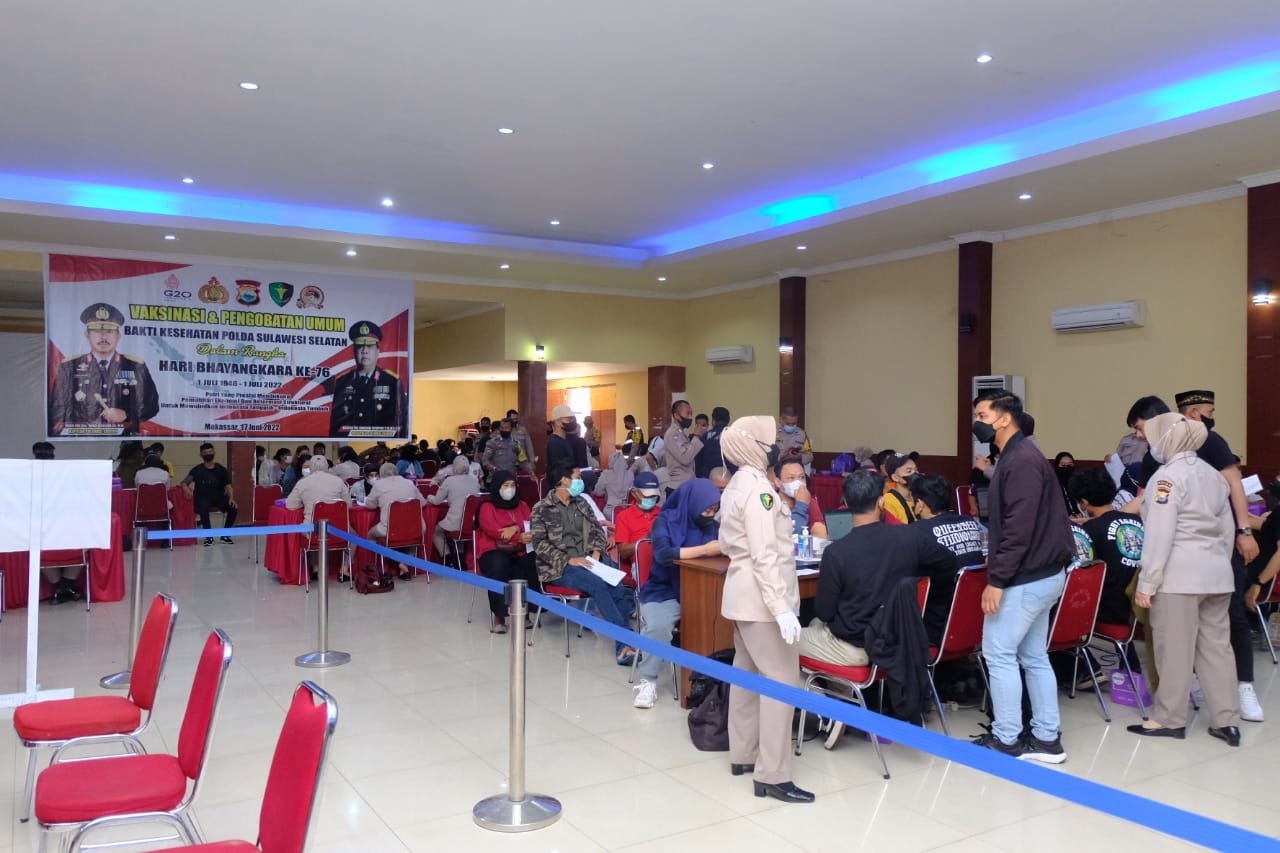 Polda Sulsel menggelar Vaksinasi dan Pengobatan Gratis dalam rangka Hari Bhayangkara ke-76 di SPN Polda Sulsel Jl. Urip Sumoharjo KM.7, Tello Baru, Kecamatan Panakkukang, Kota Makassar, Sulawesi Selatan, Jumat (17/06/2022).
