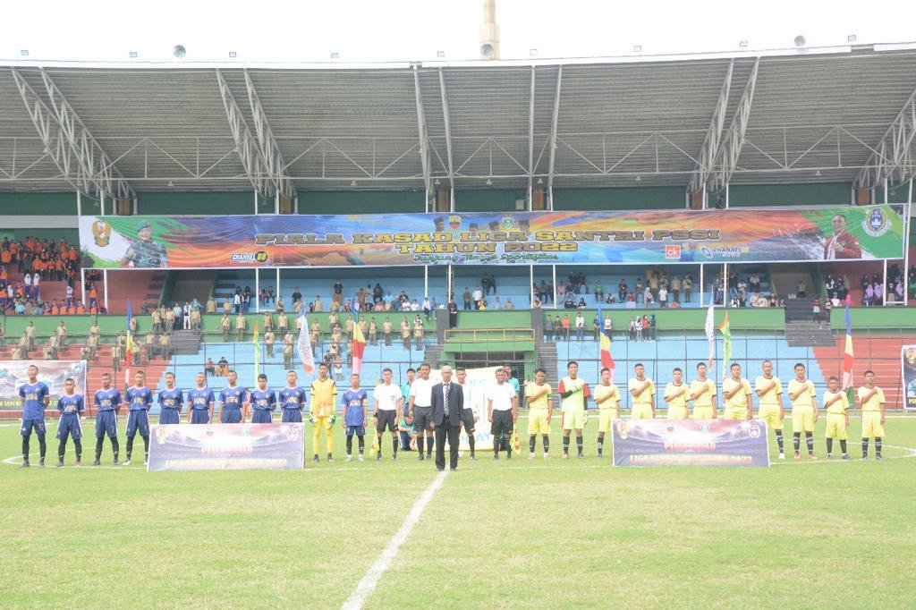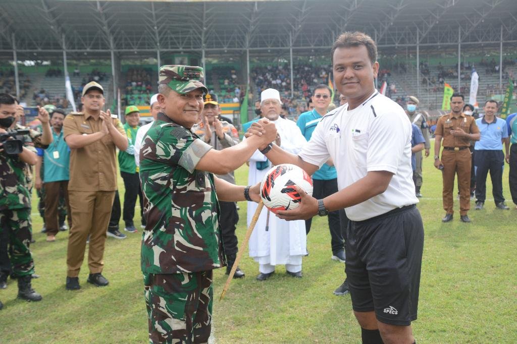 Pangdam I/BB, Mayjen TNI Achmad Daniel Chardin, SE, MSi, bersama Kapoldasu, Irjen Pol RZ Panca Putra Simanjuntak, MSi, dan unsur Forkopimda Sumut lainnya melakukan kick off turnamen sepak bola Piala Kasad Liga Santri PSSI Tahun 2022 Wilayah Kota Medan bertempat di Stadion Teladan Medan, Senin (20/06/2022) sore.