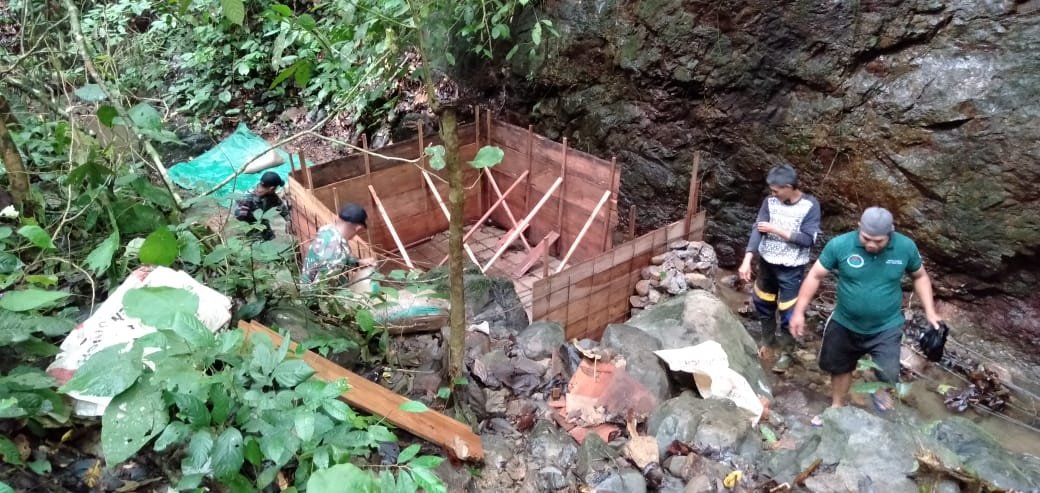 Satgas Pamtas RI-Malaysia Yonif 645/Gty gelar karya bakti bersama warga membersihkan air sungai dan membuat bak penampung air bersih, Dusun Lubuk Sabuk, Desa Lubuk Sabuk, Kecamatan Sekayam, Kabupaten Sanggau.