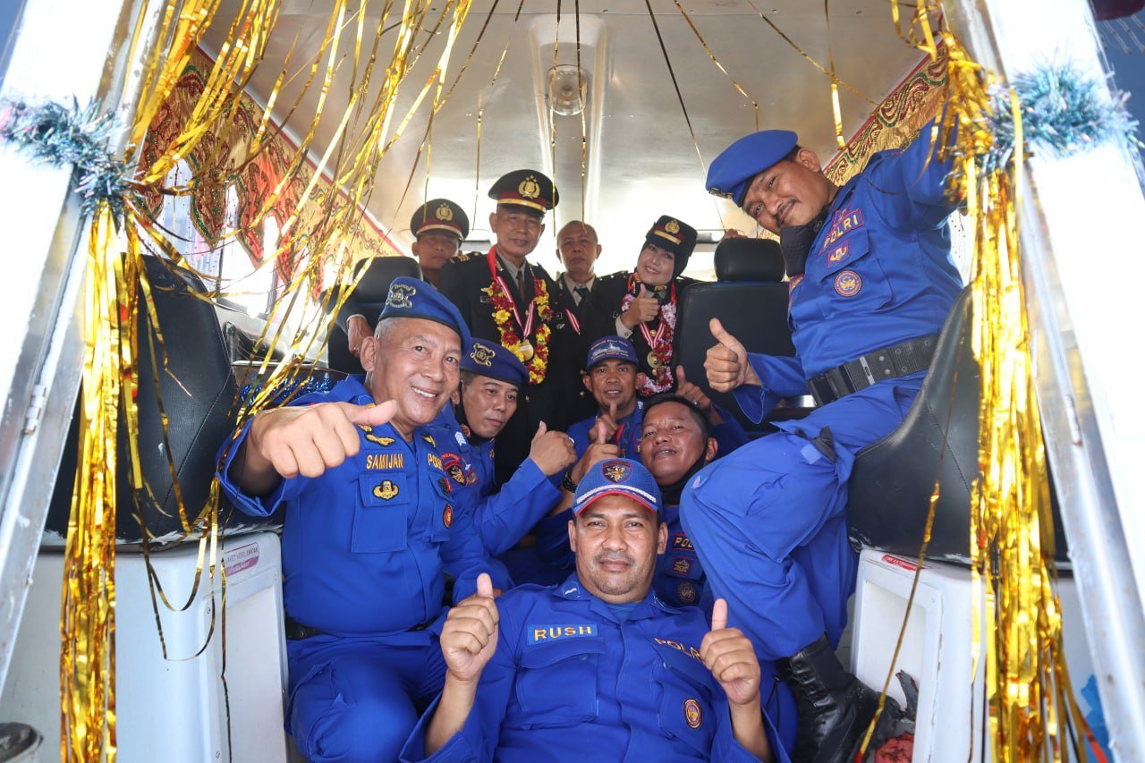 Polres Pelabuhan Makassar melepas anggotanya yang telah Purnabakti dengan cara yang unik yaitu mengantarkan mereka dengan mobil dan kapal speed, Kamis (30/06/2022).
