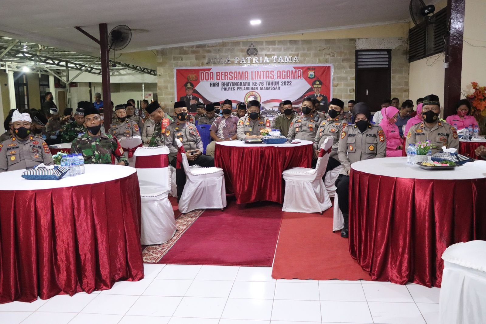 Kapolres Pelabuhan Makassar AKBP Yudi Frianto SIK, MH mengikuti kegiatan Doa Bersama Lintas Agama Presisi dalam rangka Hari Bhayangkara ke–76 yang digelar secara virtual dari Mabes Polri, Jumat (01/07/2022).