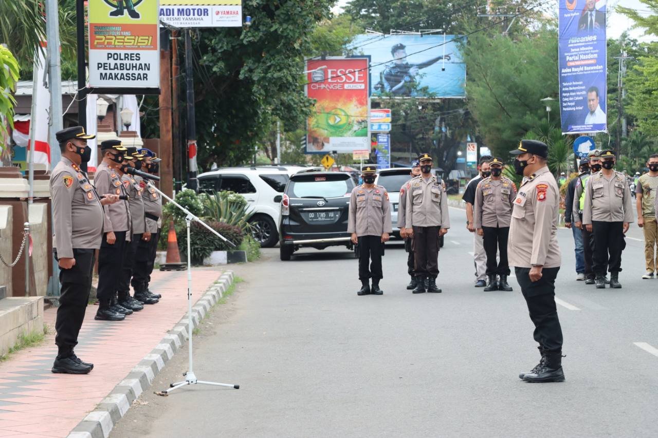 Kapolres Pelabuhan Makassar AKBP Yudi Frianto, SIK, MH memimpin apel siaga dalam rangka pengamanan malam takbiran dan sholat Idul Adha 1443 H, di depan Mapolres tersebut, Sabtu (09/07/2022).